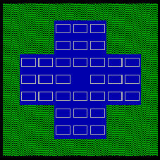 32 movable pegs ("+") are arranged on the following board such that